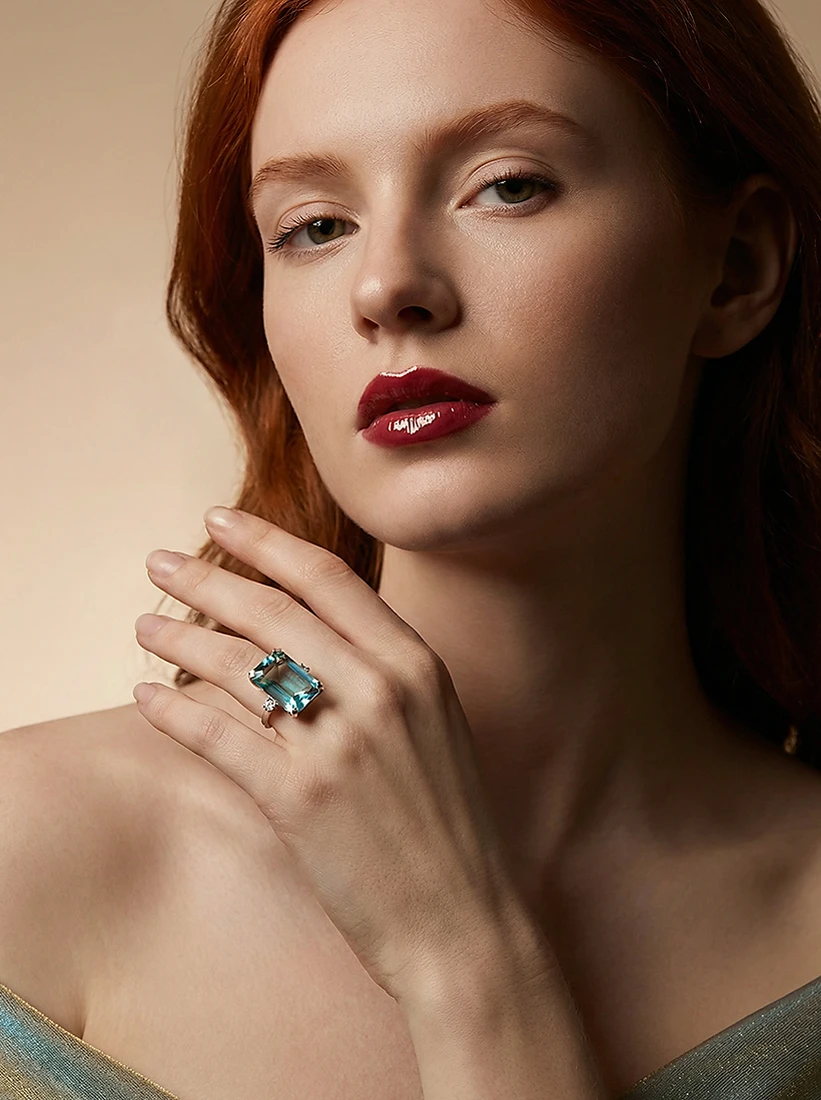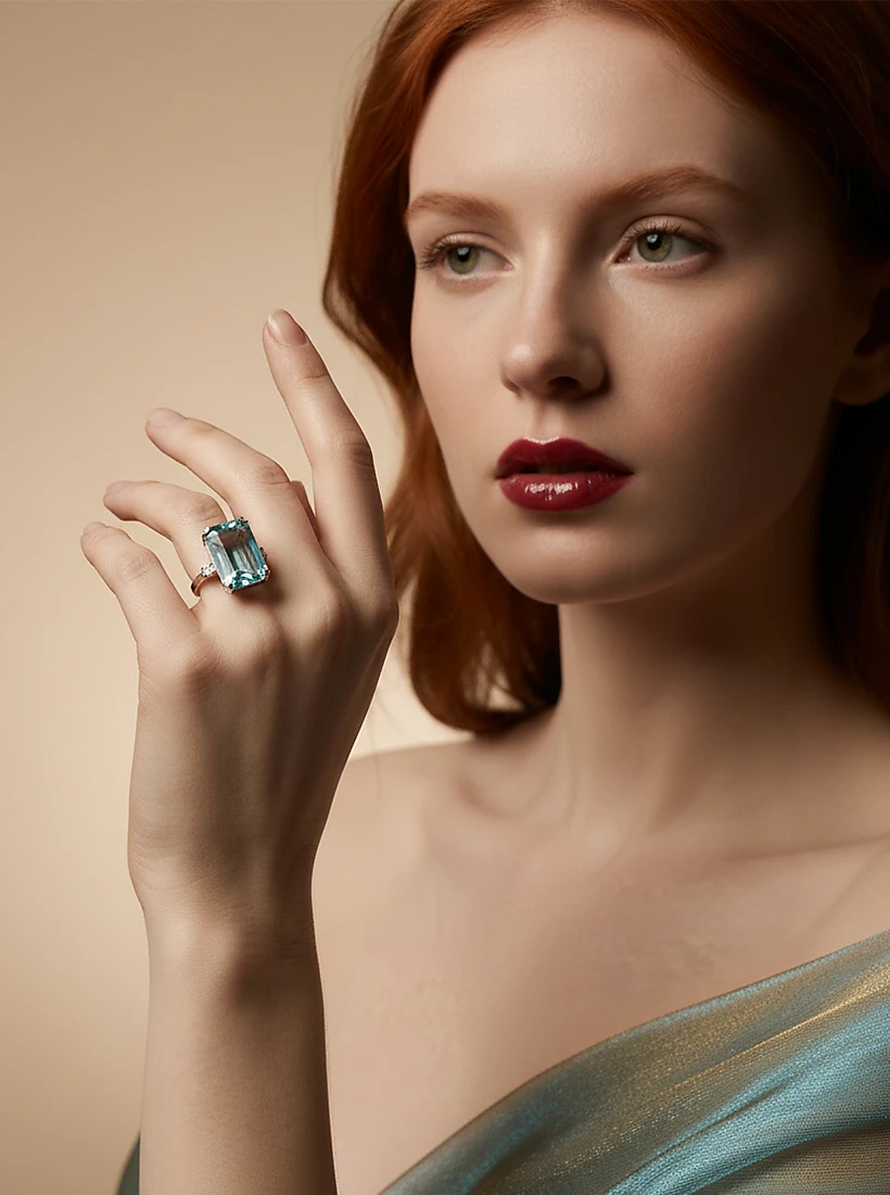 A tonalidade azul luminosa envolve os gestos com um brilho fresco e etéreo, elevando a delicadeza das mãos com graça natural. Uma joia que traduz elegância serena e charme cintilante em cada movimento.