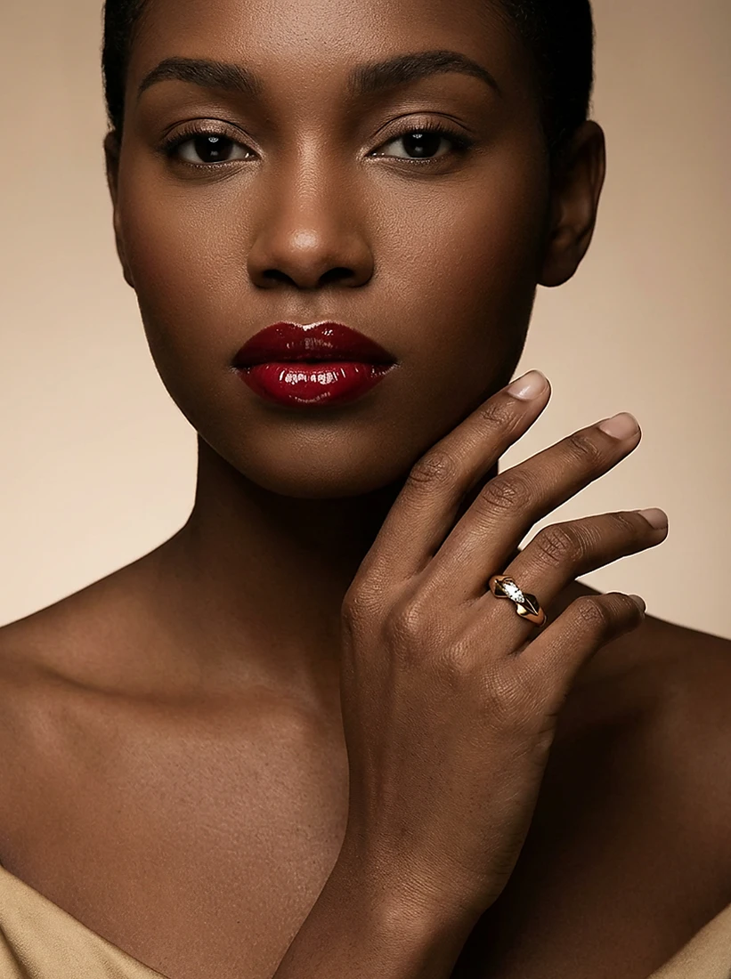 A luz repousa com suavidade sobre cada curva, criando um brilho sereno que valoriza a delicadeza dos gestos. Uma peça que envolve as mãos com sutileza radiante, revelando charme e feminilidade em cada movimento.