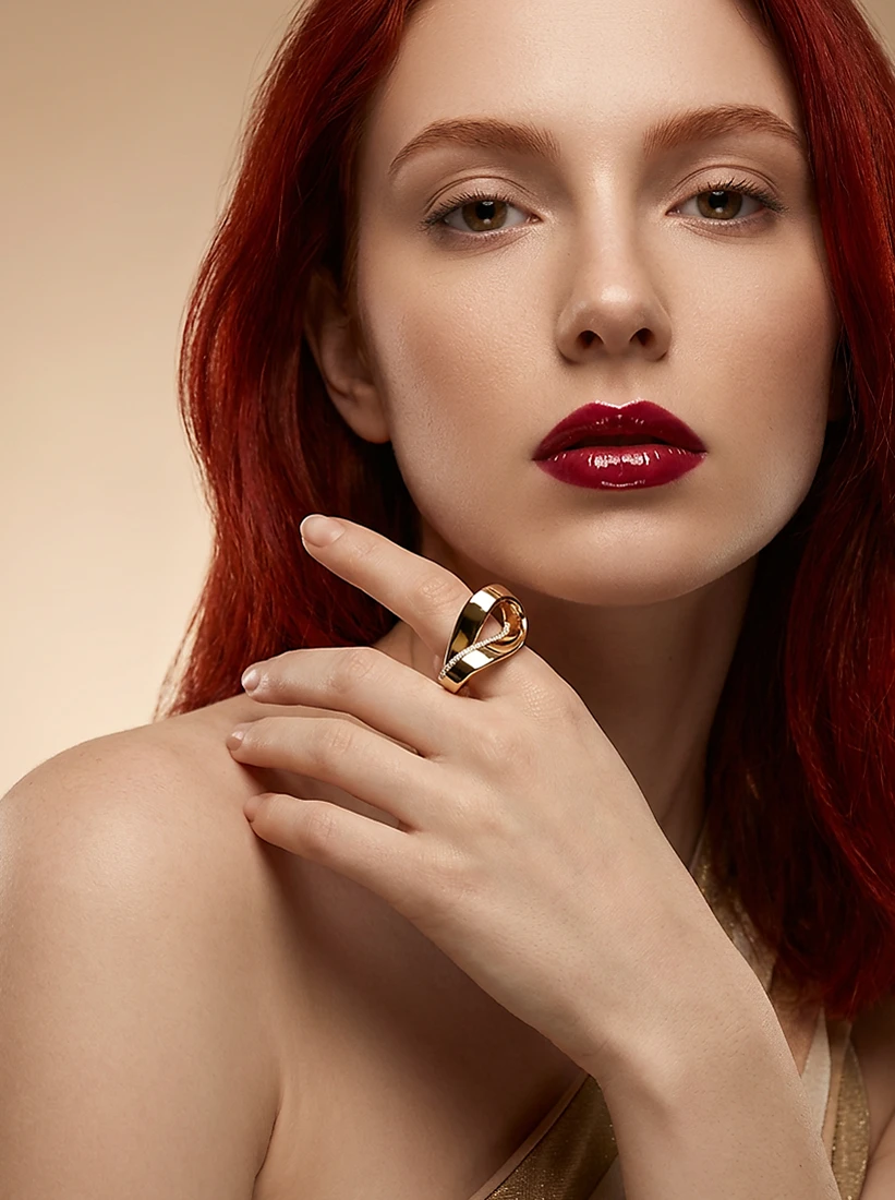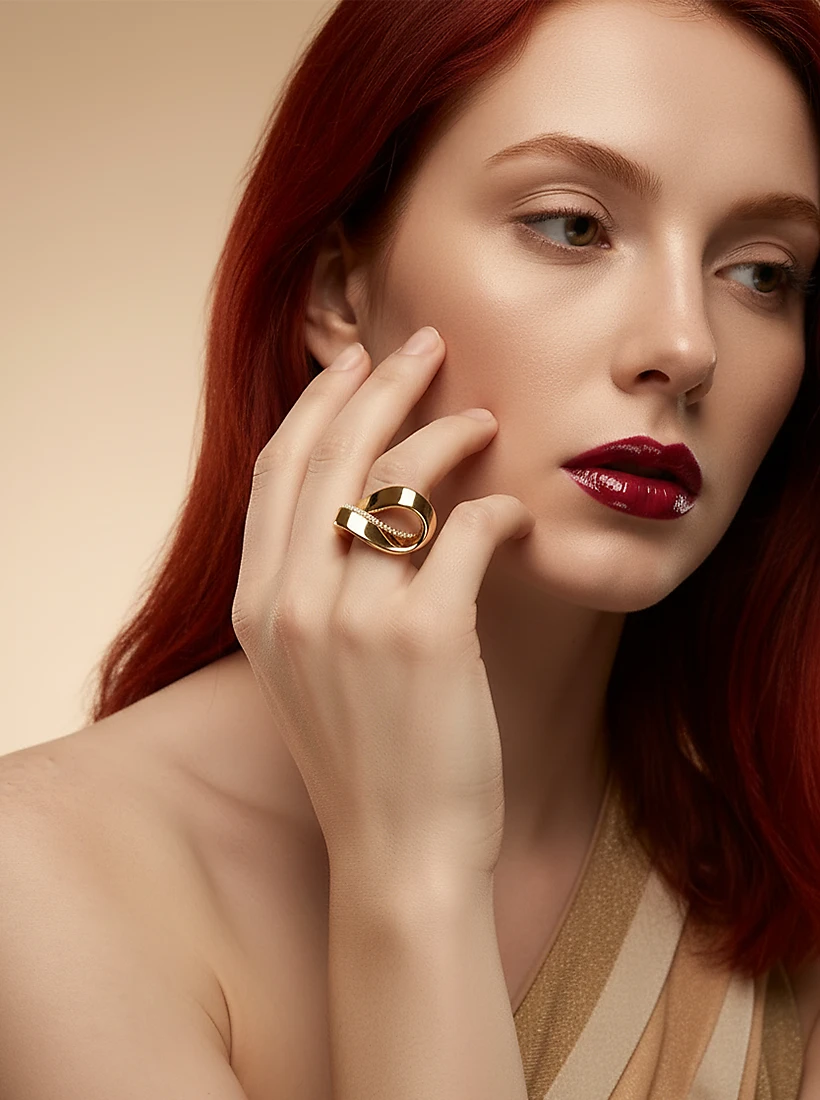 O brilho suave percorre as curvas douradas com leveza encantadora, destacando cada gesto com elegância natural. Sua forma envolvente cria um ponto de luz contemporâneo que celebra feminilidade e sofisticação em perfeita harmonia.