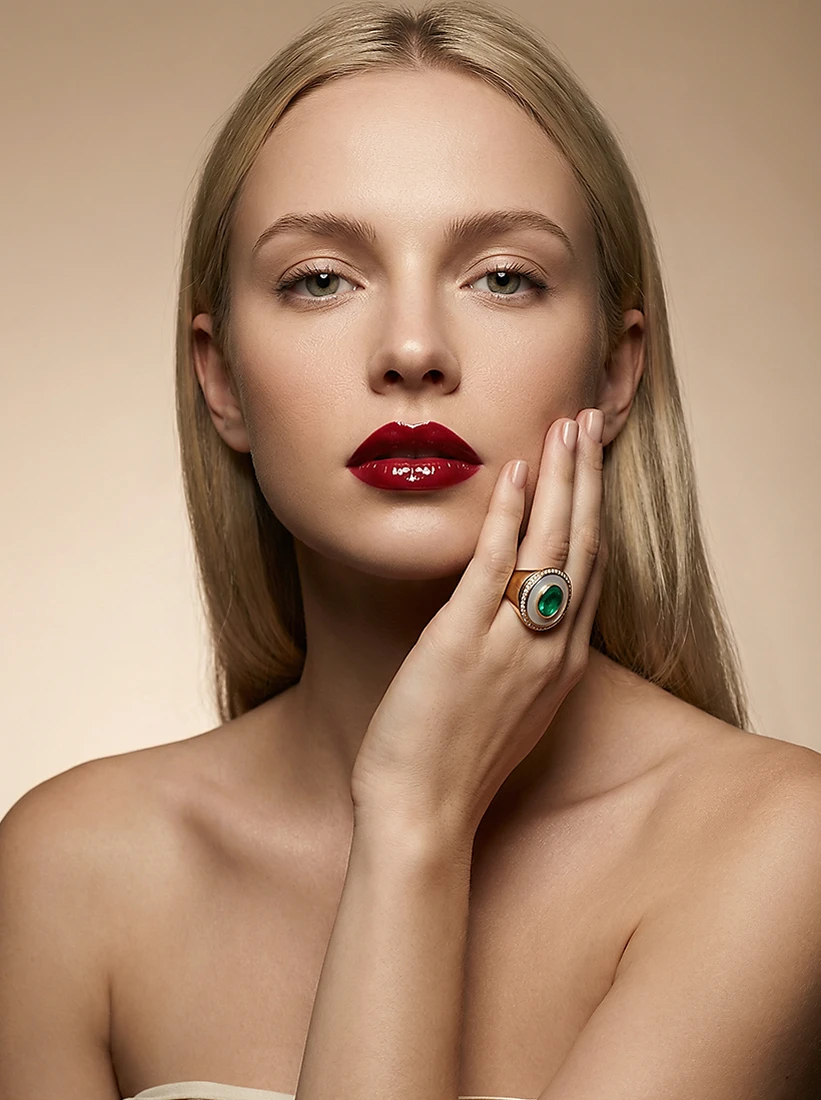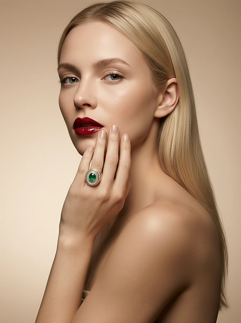 O verde profundo resplandece com nobreza, envolto por um brilho dourado que valoriza cada gesto com distinção. Uma peça que transforma as mãos em palco de elegância, irradiando charme atemporal e sofisticação natural.