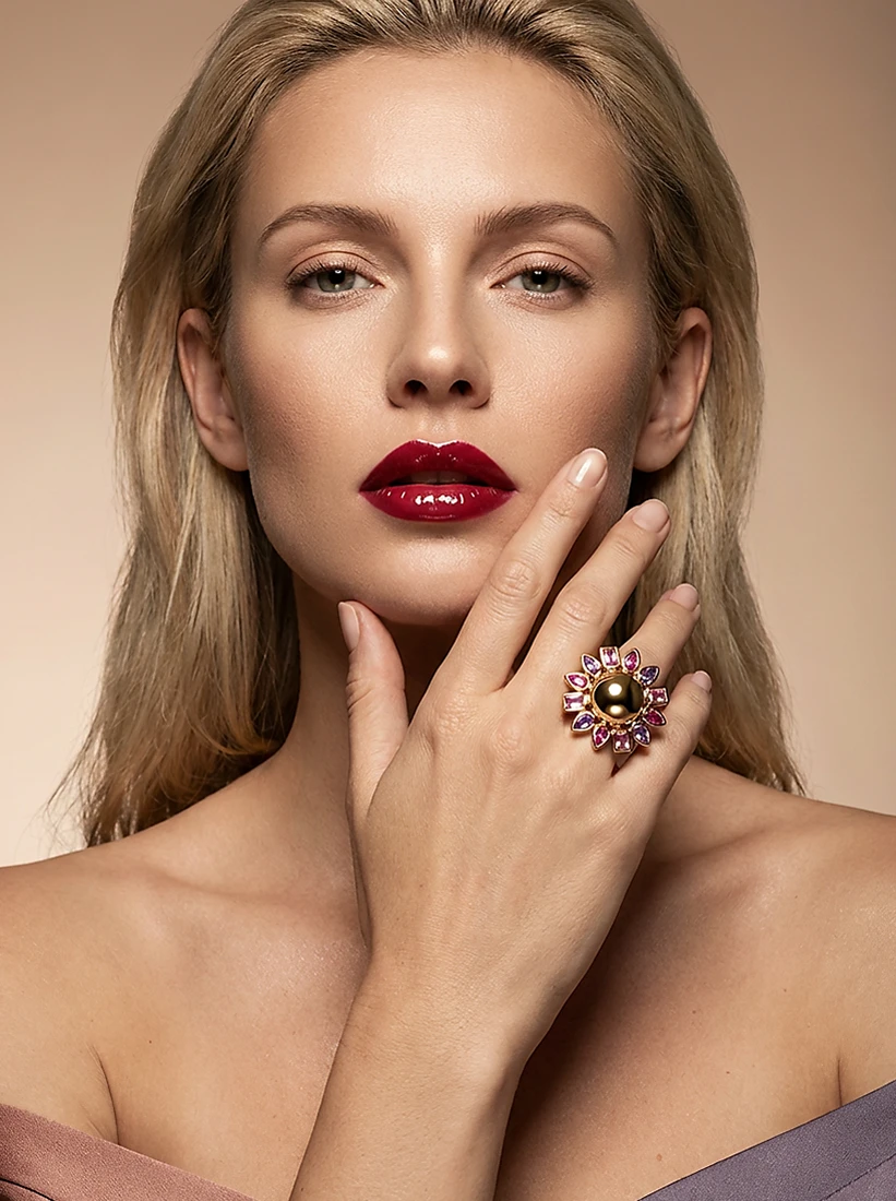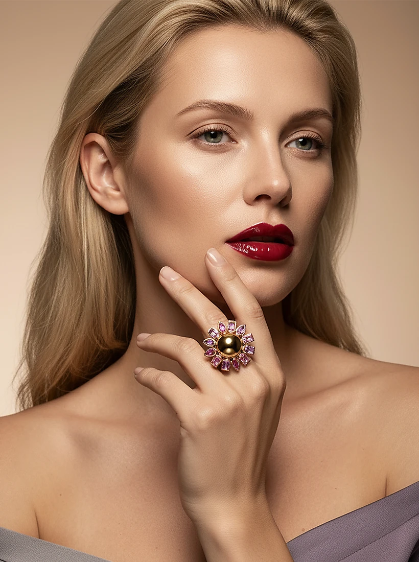 As pétalas cintilantes envolvem o dourado com um brilho suave e feminino, trazendo poesia e intensidade a cada gesto. Uma peça que transforma a mão em um jardim de luz, revelando charme radiante e elegância atemporal.
