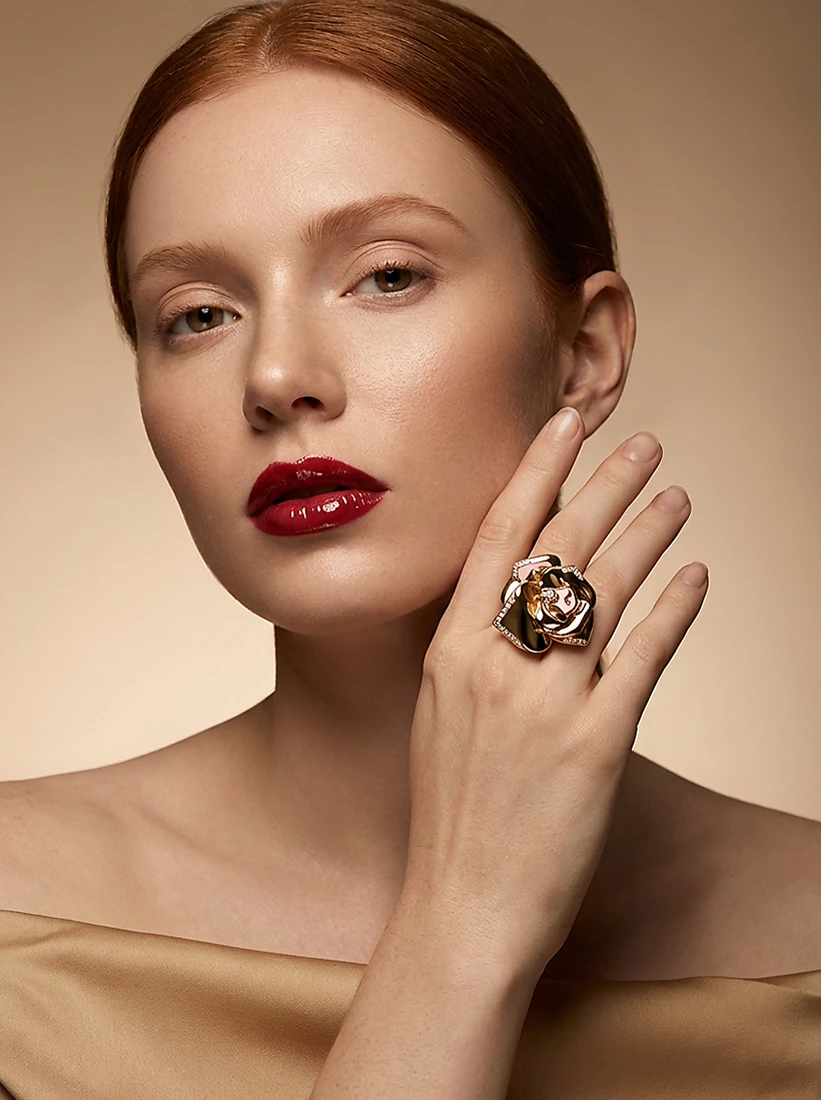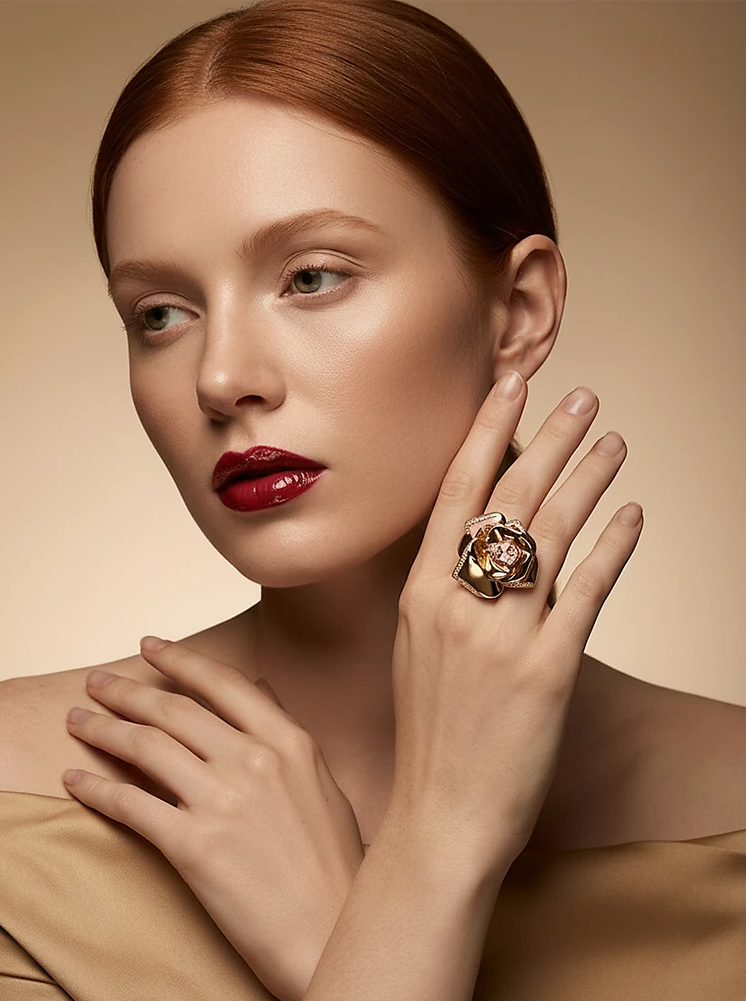 As pétalas douradas se iluminam com cada movimento, enquanto o toque rosado acrescenta poesia ao brilho metálico. Uma peça que envolve as mãos com exuberância delicada, revelando feminilidade e elegância em uma composição de luz e arte.