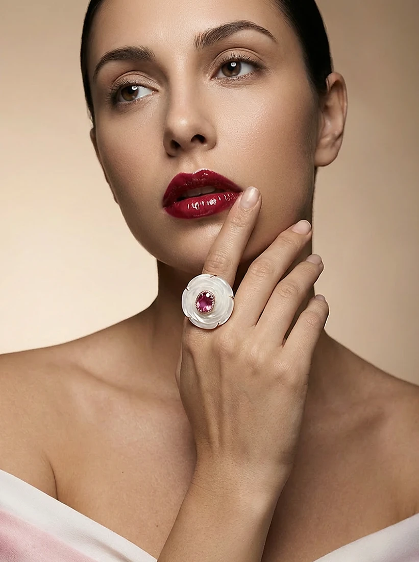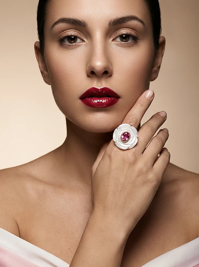 A madrepérola irradia suavidade enquanto o rosa vibrante adiciona um toque de paixão luminosa, revelando graça e encanto a cada movimento. Uma peça que envolve as mãos com poesia refinada e feminilidade atemporal.