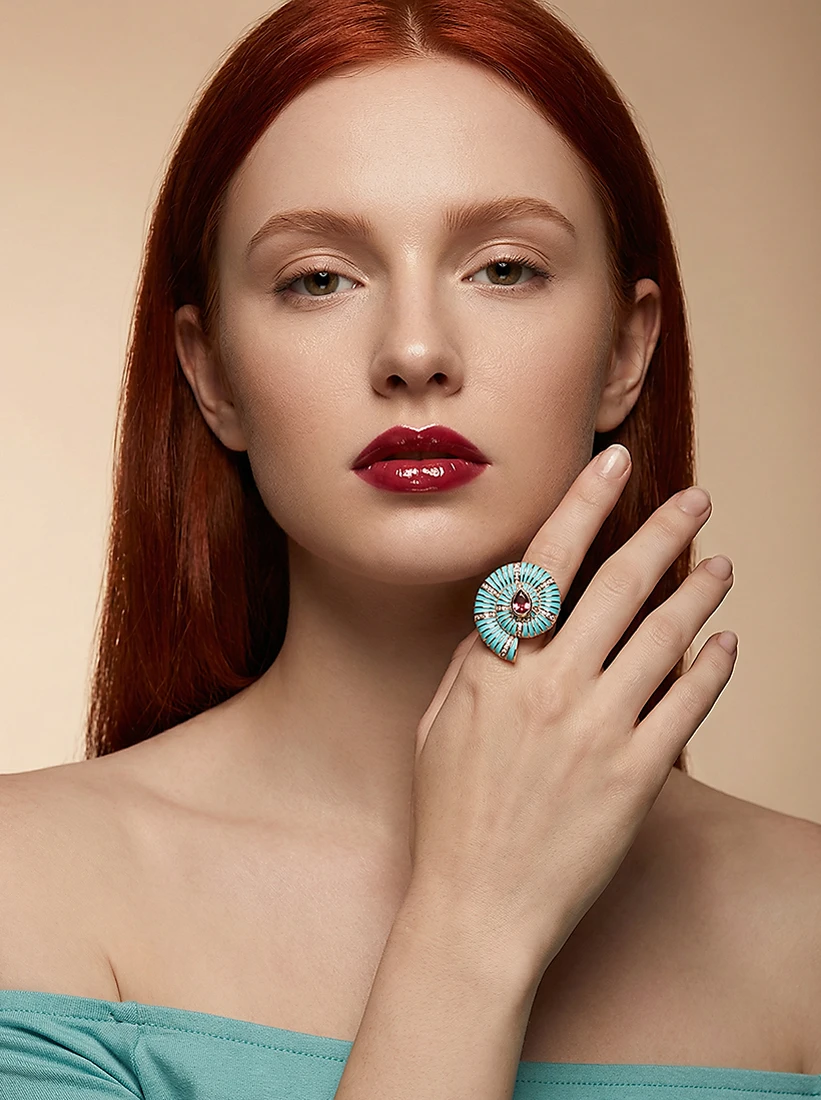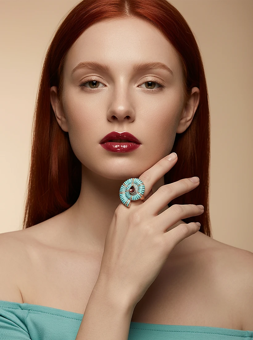 As nuances turquesa e o brilho avermelhado se encontram em um movimento hipnotizante, revelando um charme que ilumina cada gesto com presença cativante. Uma peça que adiciona poesia e ousadia às mãos, realçando a feminilidade com elegância singular.