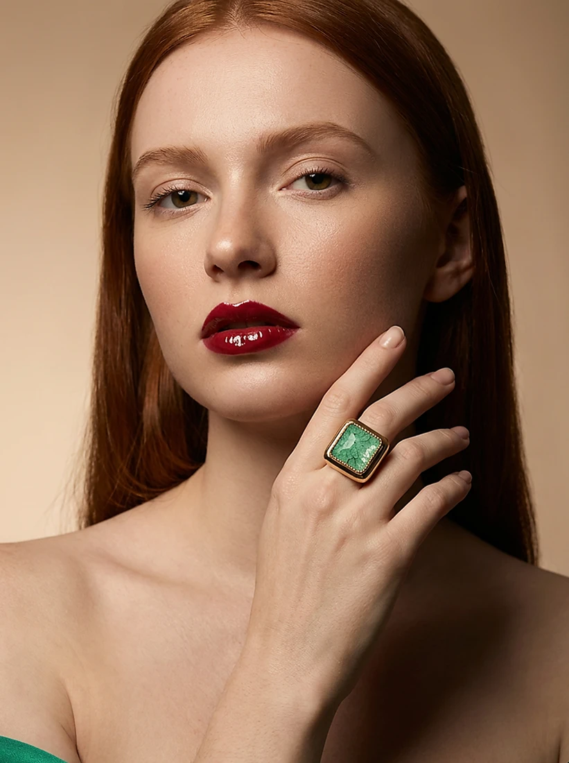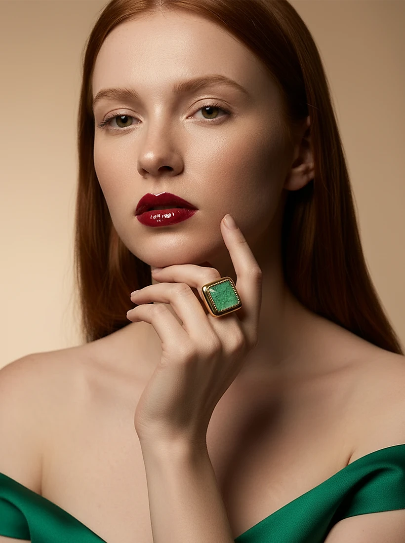 O verde intenso irradia uma aura de elegância imponente, transformando cada gesto em um momento de brilho refinado. Uma peça que envolve as mãos com charme atemporal, revelando feminilidade e presença com delicada majestade.