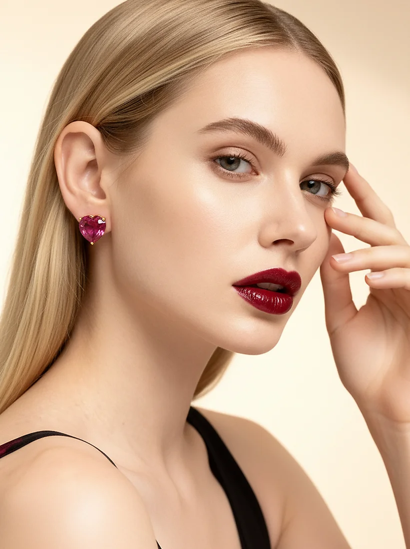 Um brilho rosado que ilumina o rosto com suavidade encantadora, revelando delicadeza e charme em cada reflexo. Sua forma romântica adiciona feminilidade serena, elevando o olhar com elegância simples e irresistível.