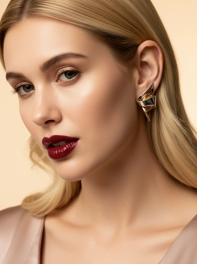 Um dourado envolvente abraça o rosto com fluidez sofisticada, revelando brilho intenso a cada ângulo. Suas linhas sinuosas criam um efeito cativante, conferindo presença elegante e charme atemporal.