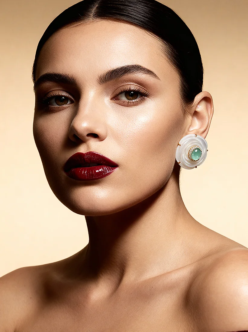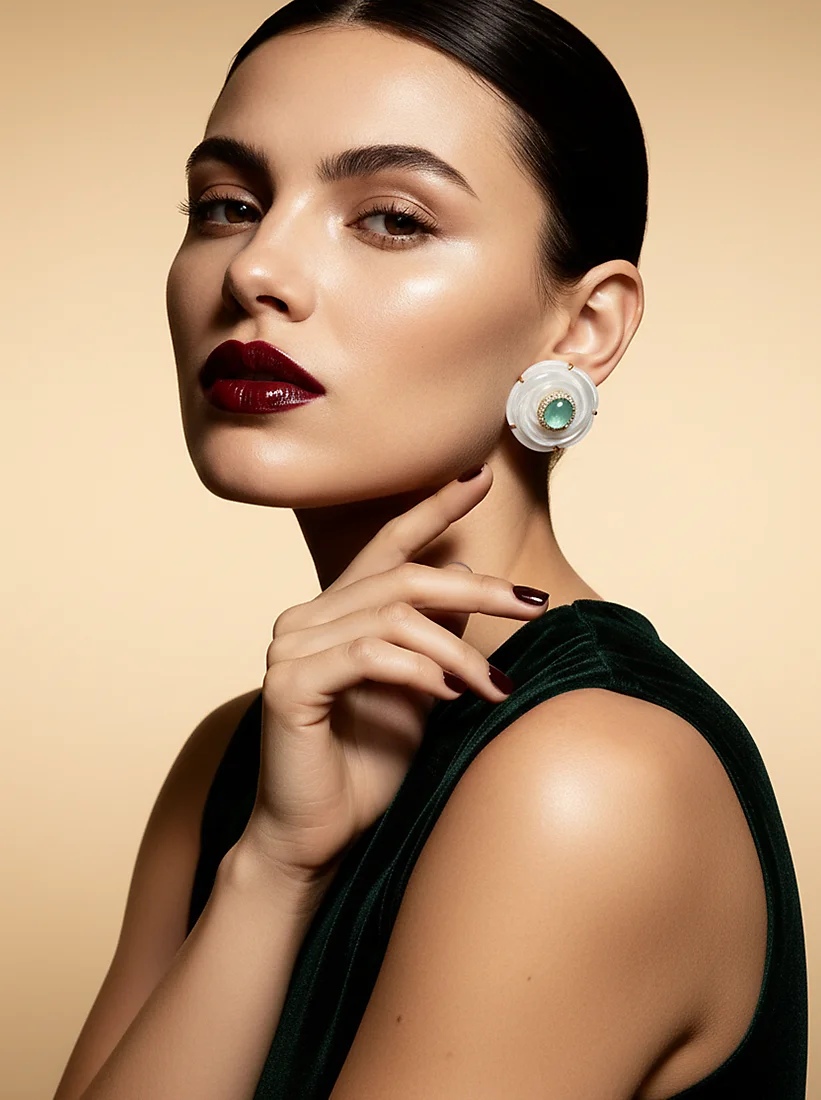 Uma luz suave floresce ao redor do rosto, revelando brilho sereno e feminilidade encantadora. O toque perolado e o tom verde suave criam um aura de delicadeza atemporal, perfeita para realçar cada gesto com graça natural.