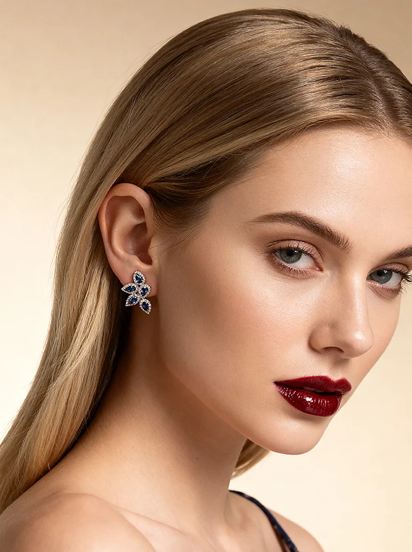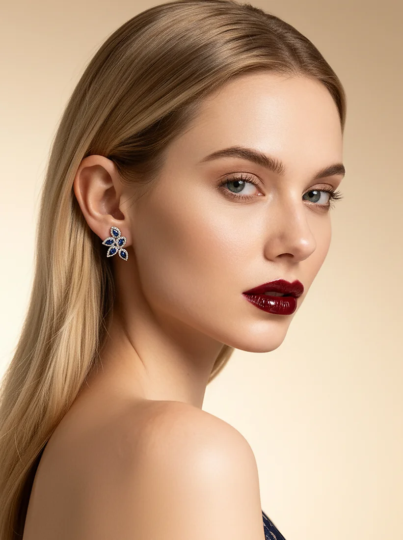 Com pétalas que parecem dançar à luz, o azul intenso ganha vida em um toque de frescor elegante. Uma joia que valoriza a expressão feminina com graça luminosa e charme sereno.