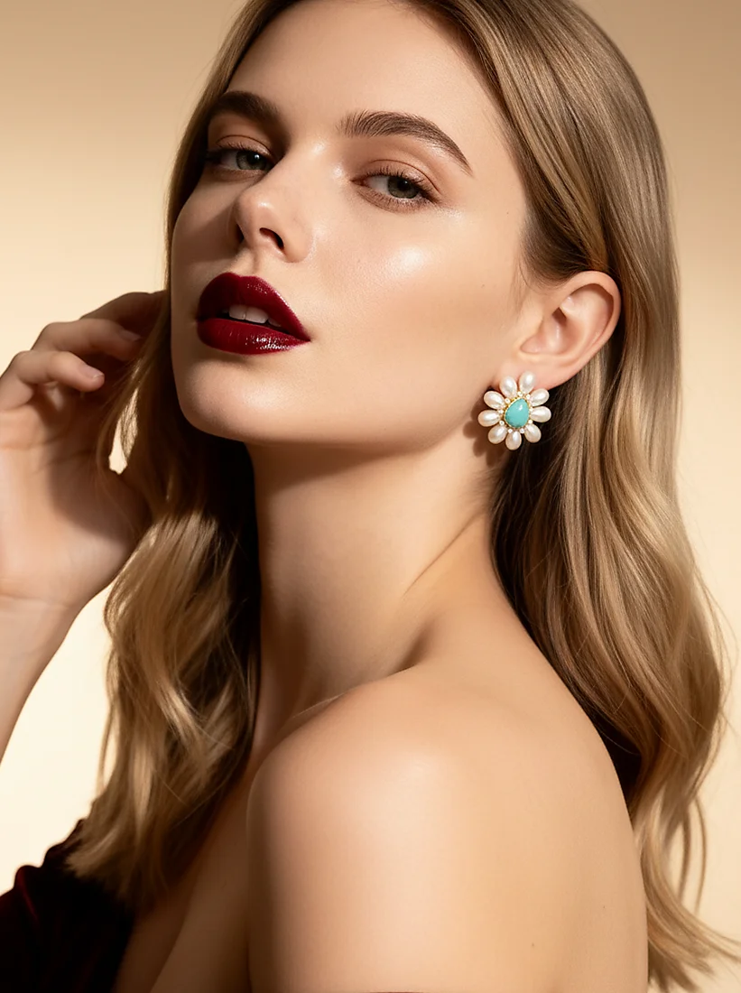 Um delicado encontro entre pérolas suaves e turquesa vibrante, criando um brinco floral que ilumina o rosto com graça sofisticada e charme atemporal.