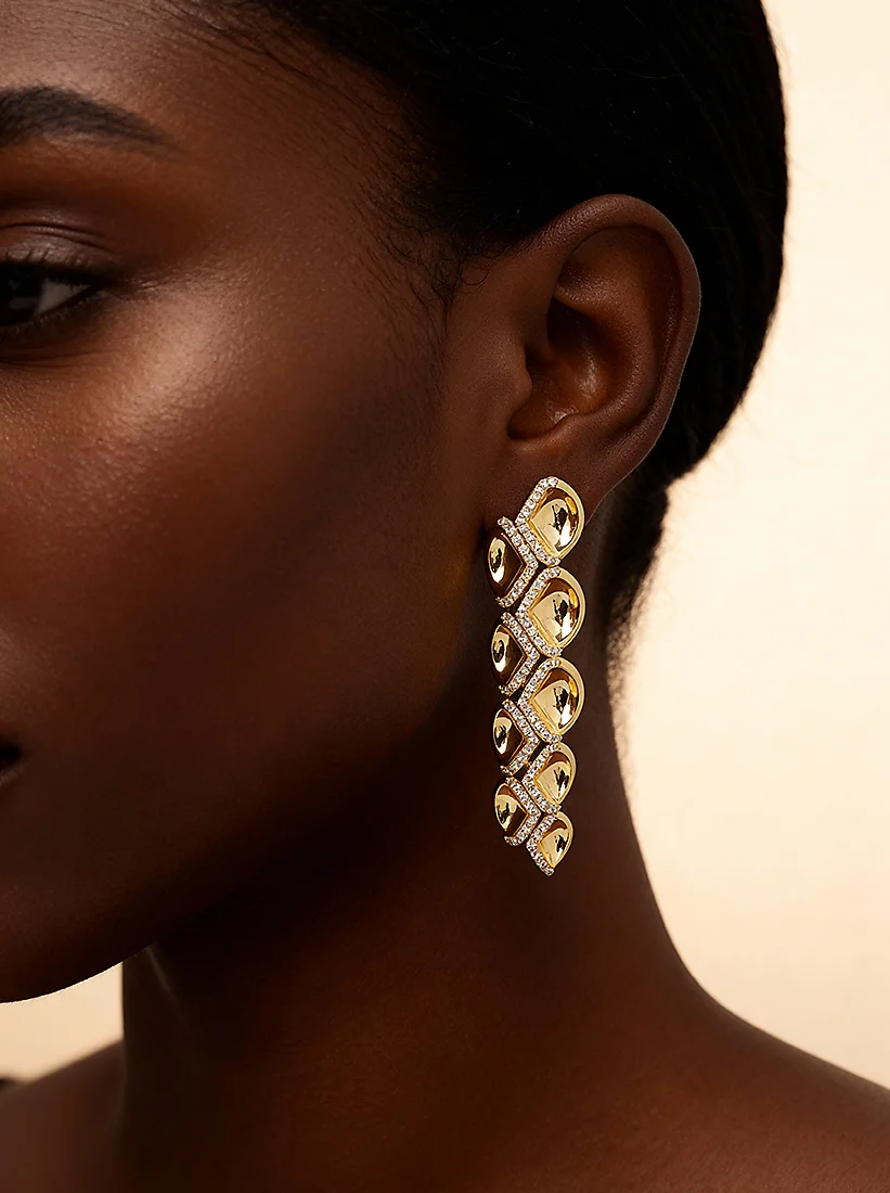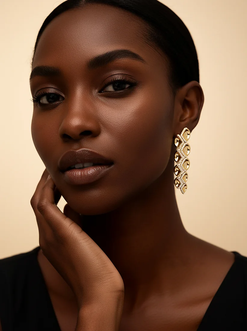 Um dourado fluido acompanha o rosto com brilho delicado, revelando elegância natural em cada gesto. A luz que percorre seus elos traz sofisticação silenciosa, criando um efeito cativante e atemporal.