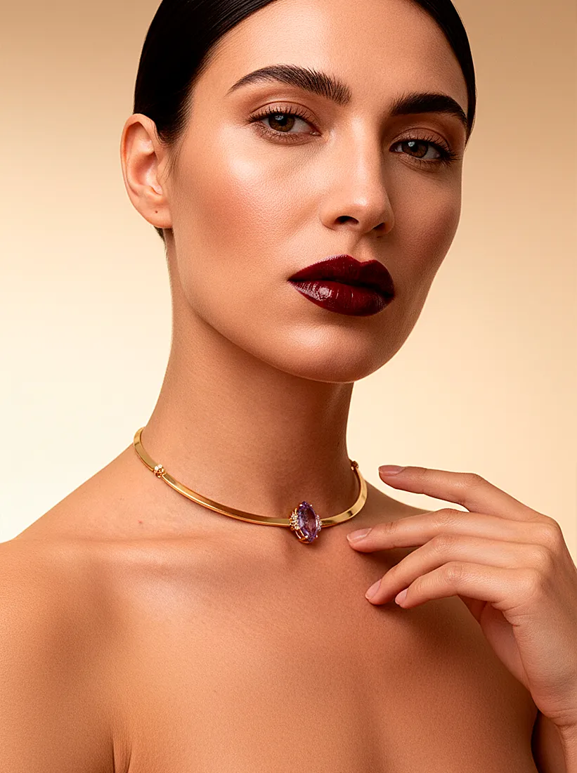 Um choker de design moderno e elegante que envolve o pescoço com um brilho dourado suave, destacando ao centro uma ametista marquise que irradia luminosidade e delicadeza. A combinação do metal polido com o tom lilás cria um contraste sofisticado, resultando em uma peça que transmite luxo discreto, feminilidade e presença marcante em qualquer ocasião.