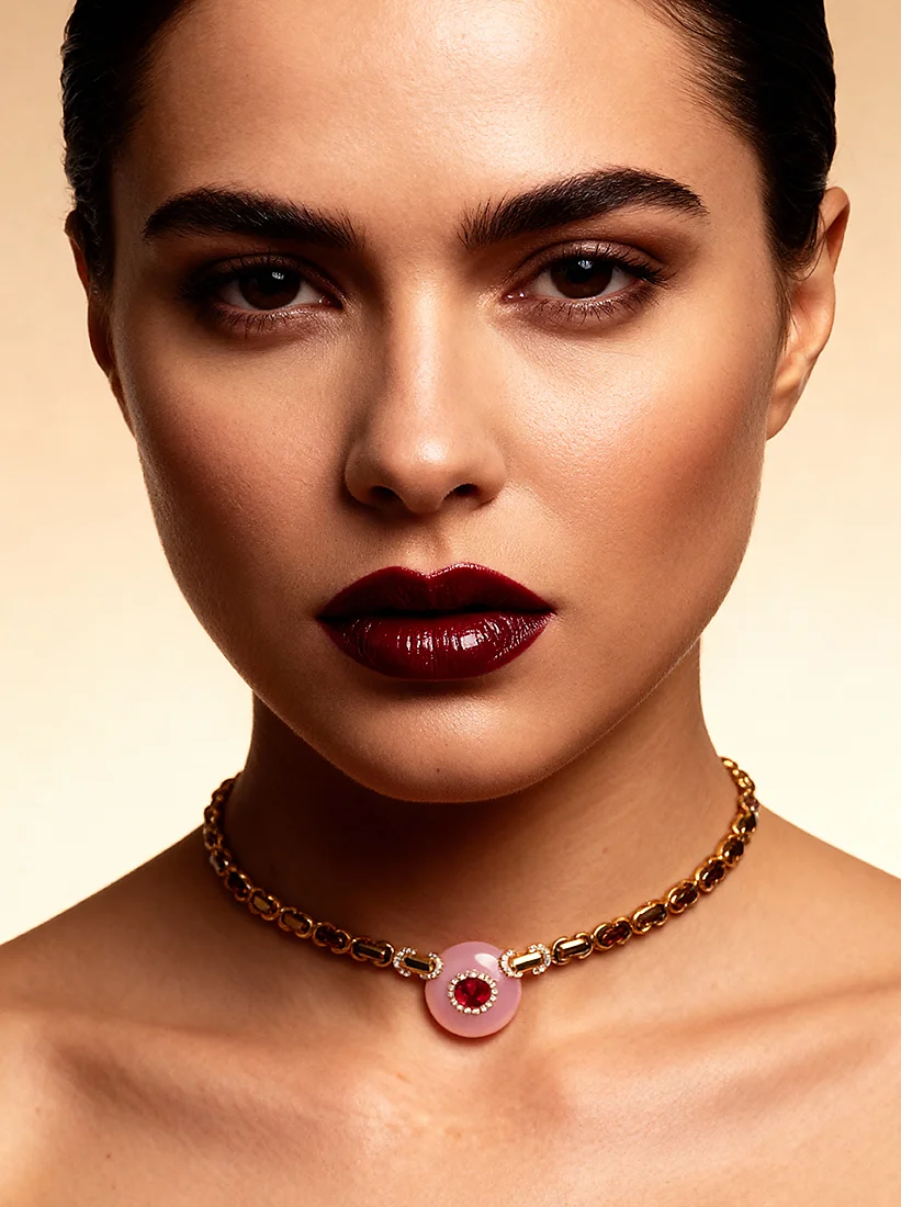 Uma joia que envolve o colo com suavidade cintilante, unindo tons rosados e dourados em perfeito equilíbrio. O detalhe central irradia charme delicado, criando uma presença elegante e irresistivelmente feminina.