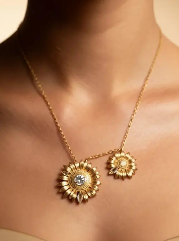 Uma joia que ilumina o colo com delicada exuberância, revelando um brilho ensolarado que encanta em cada ângulo. As formas florais acrescentam charme expressivo e feminino, criando uma presença luminosa e irresistivelmente refinada.