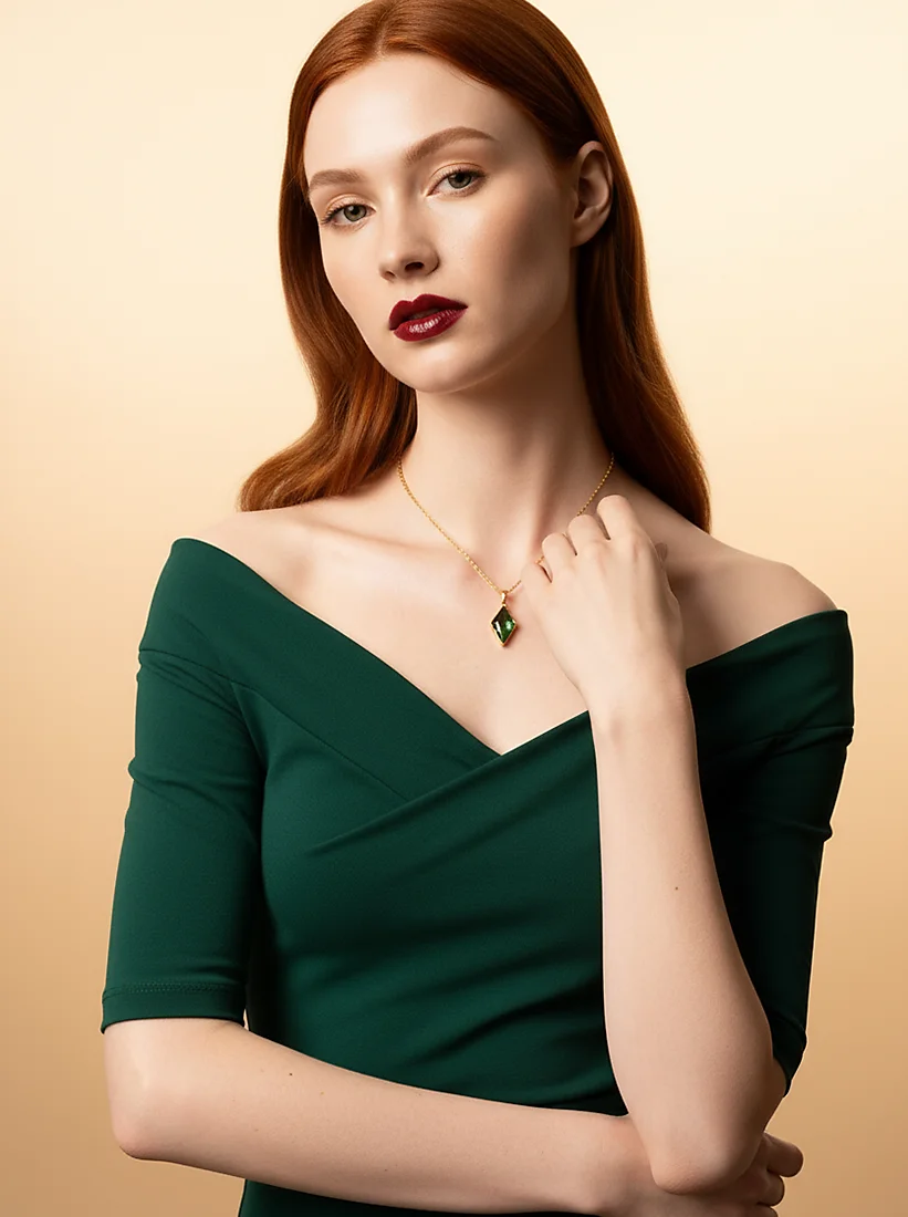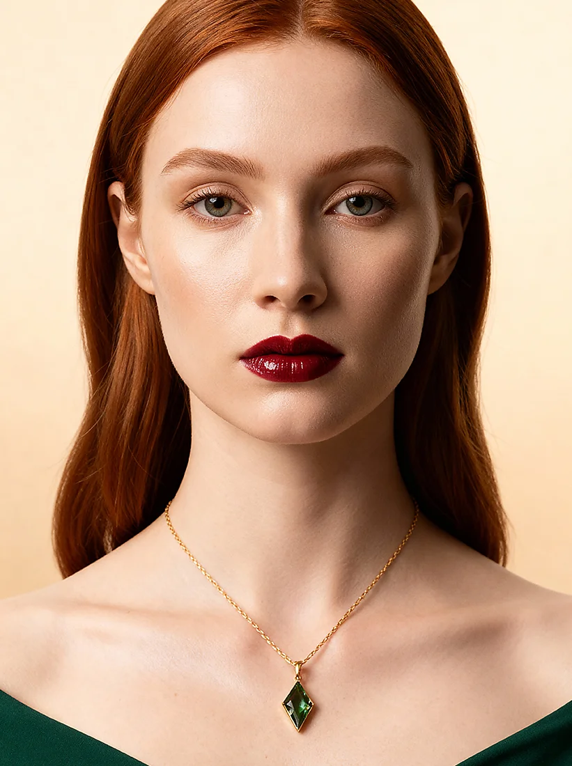 Uma joia que repousa com delicada precisão, revelando um brilho profundo e enigmático. O verde intenso do cristal acrescenta charme natural, enquanto o dourado suave envolve o colo com elegância serena. Uma peça que ilumina a presença com sofisticação discreta.