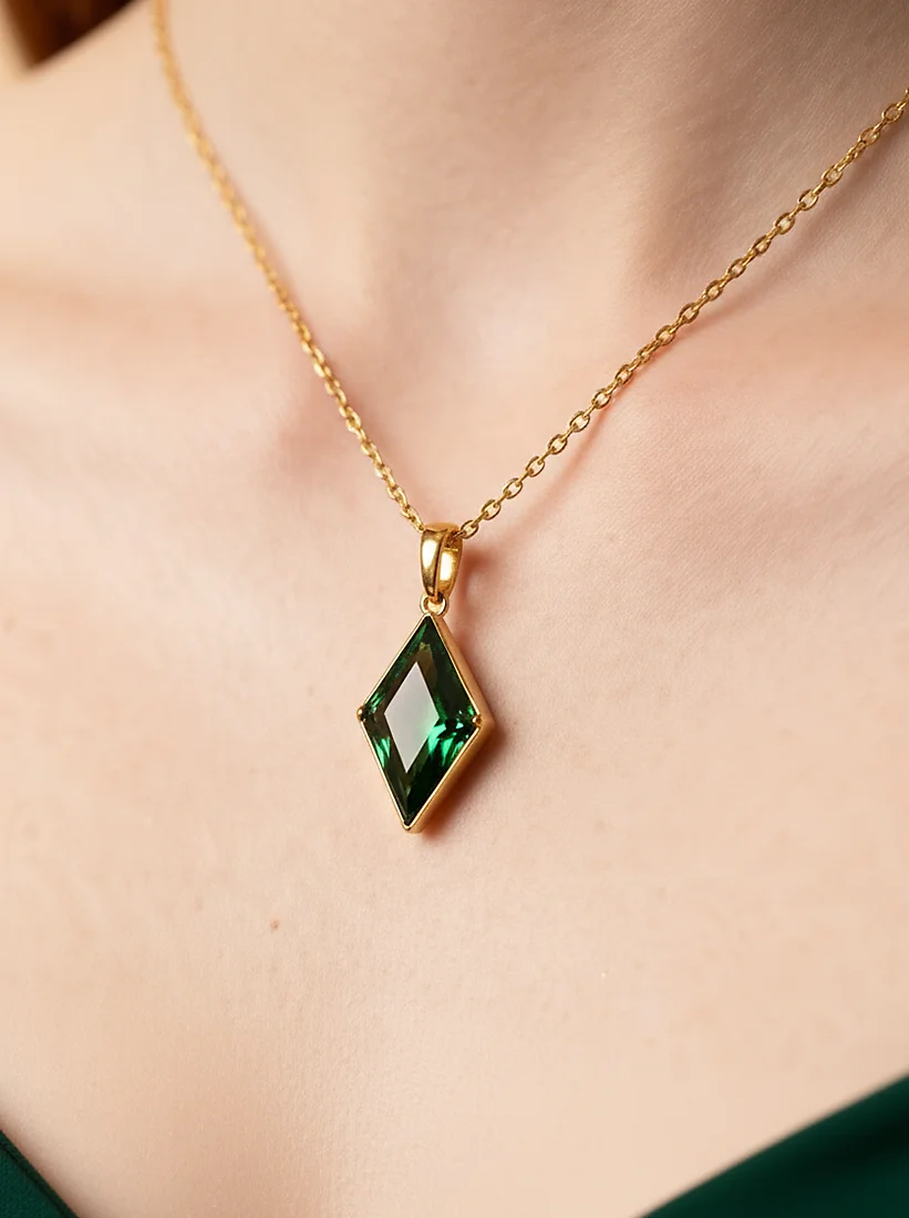 Um colar de linhas clássicas que destaca a beleza singular de um pendente geométrico. A corrente delicada em banho de ouro premium sustenta uma pedra verde de lapidação losango, cuja profundidade de cor e brilho facetado criam um contraste elegante com o dourado quente do metal. A moldura minimalista realça a intensidade do cristal, resultando em uma peça refinada, equilibrada e luminosamente sofisticada.