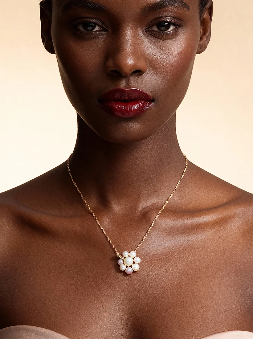O brilho aveludado das pérolas repousa sobre a pele com graça serena, criando um ponto de luz que realça o colo com doçura e sofisticação. A composição delicada espalha um charme floral que exala feminilidade e suavidade. Uma joia que envolve com elegância natural, perfeita para quem busca beleza clássica com poesia.