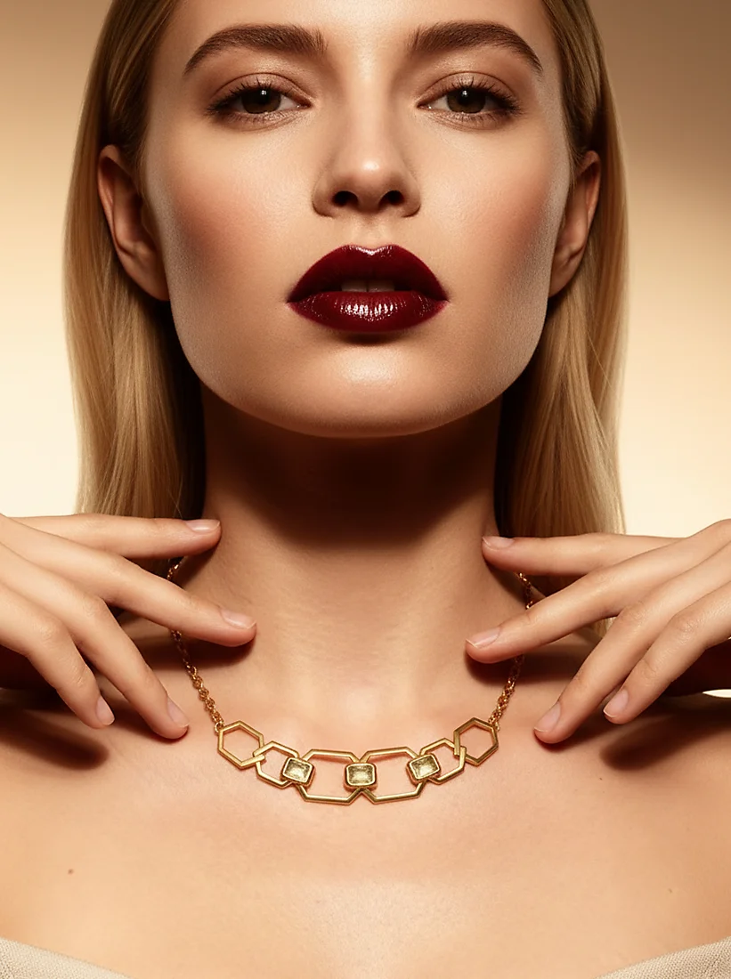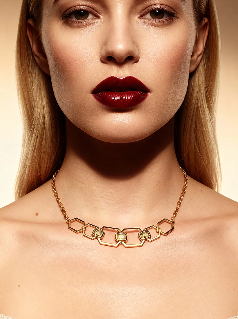 Uma joia que envolve o colo com harmonia geométrica, revelando um brilho delicado que acompanha cada movimento. As formas interligadas criam um charme contemporâneo, enquanto o dourado acrescenta calor e elegância à presença.