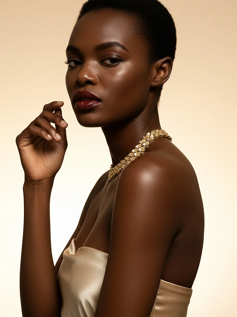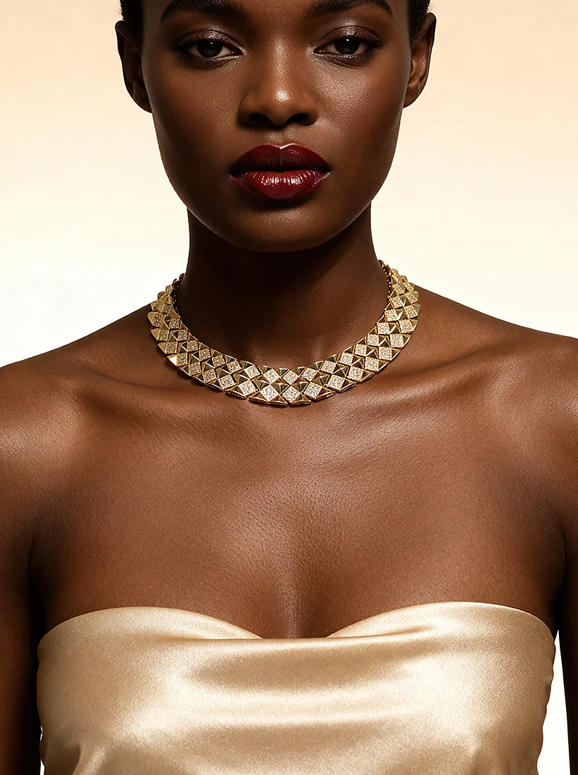 Um colar escultural de pirâmides douradas que ilumina o colo com brilho intenso e elegância poderosa. Uma joia de impacto e presença.