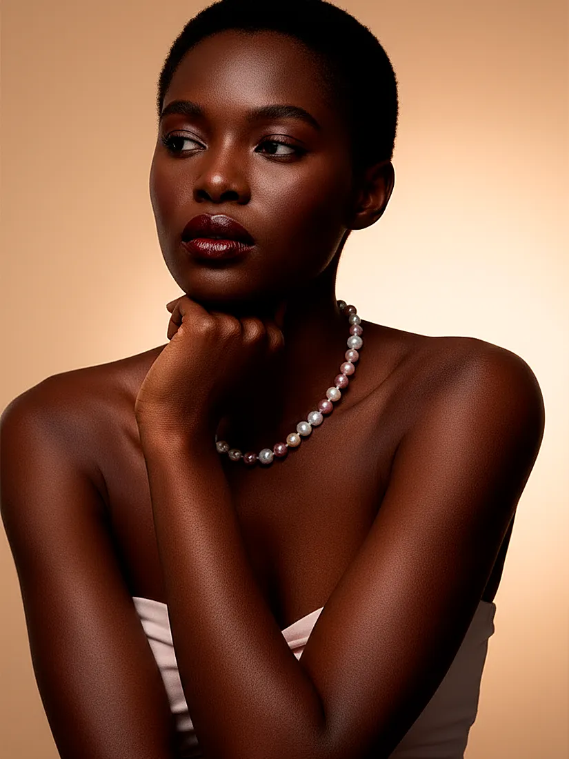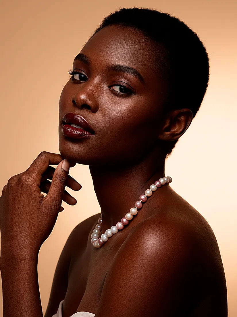 Uma joia que repousa com graça sobre o colo, revelando nuances peroladas que cintilam com suavidade encantadora. A composição em tons rosados acrescenta feminilidade serena, criando uma presença elegante e naturalmente sofisticada.