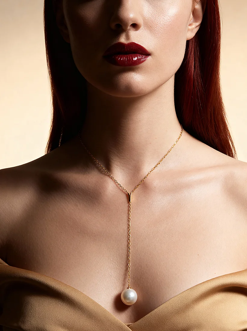 Uma joia que desliza delicadamente pelo colo, iluminando cada curva com seu brilho suave. A pérola adiciona um toque de poesia silenciosa, trazendo uma aura serena e irresistível. Um detalhe que transforma qualquer presença em puro charme atemporal.