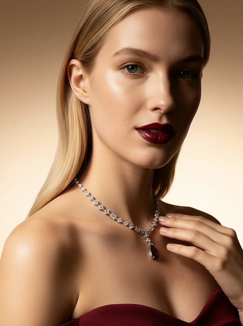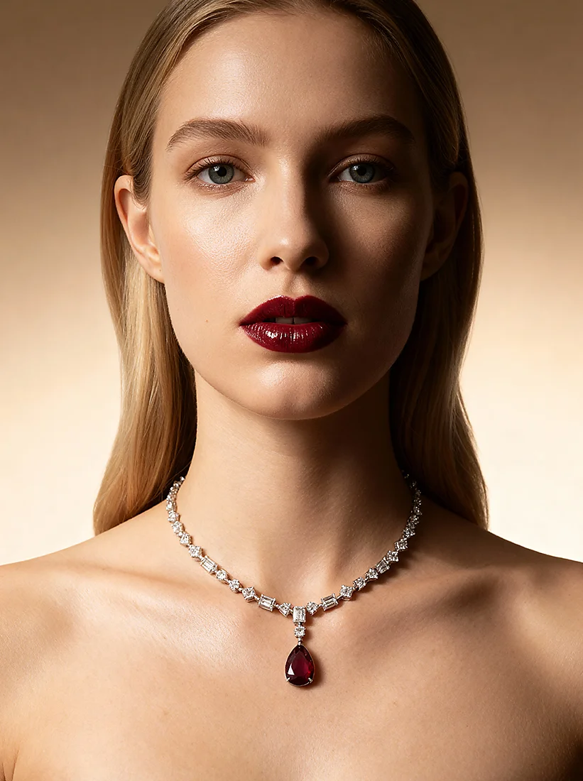 Um toque de intensidade que envolve o colo com luz e profundidade em perfeita harmonia. O rubi traz calor e presença, enquanto o brilho das zircônias traduz sofisticação pura. Uma joia pensada para revelar charme inesquecível em cada movimento.