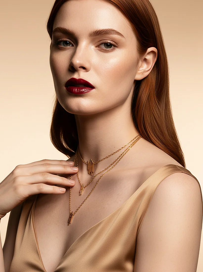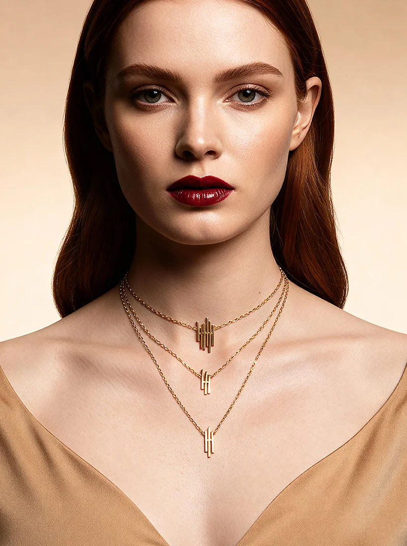 Uma joia que desliza em camadas radiantes, criando um traço elegante e contemporâneo sobre a pele. Os pendentes geométricos acrescentam ritmo e delicadeza, envolvendo o colo com charme sereno. Uma presença luminosa que eleva qualquer composição com sutileza refinada.