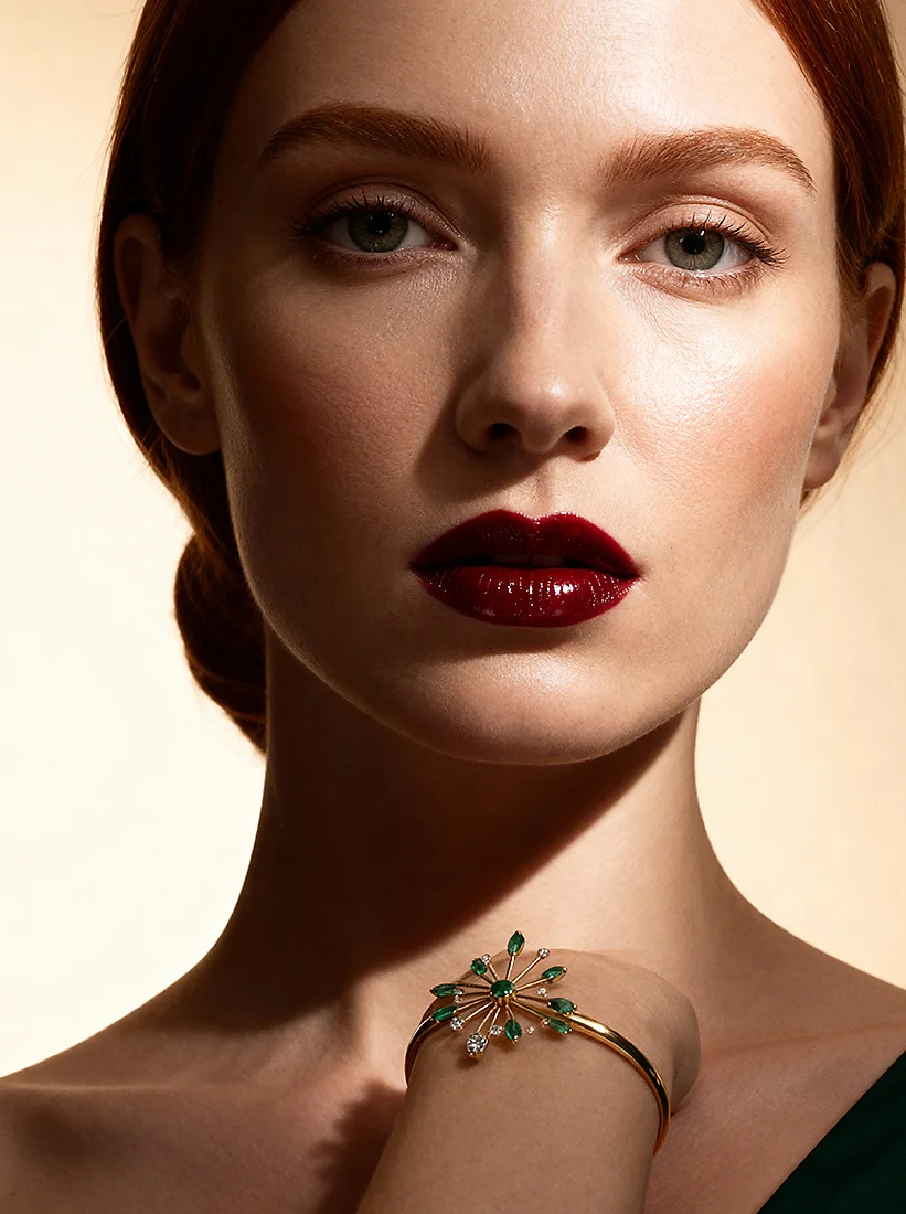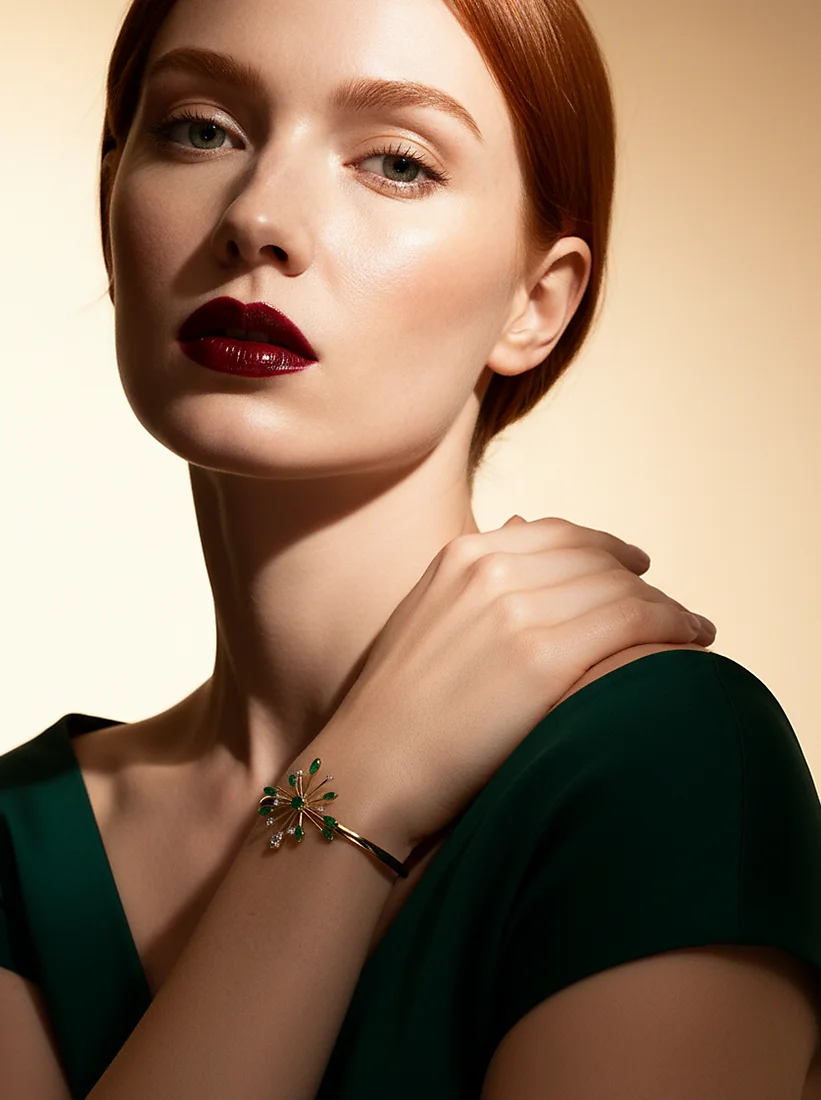 Uma delicada constelação verde repousa sobre o pulso, irradiando brilho suave e elegância etérea em cada movimento.