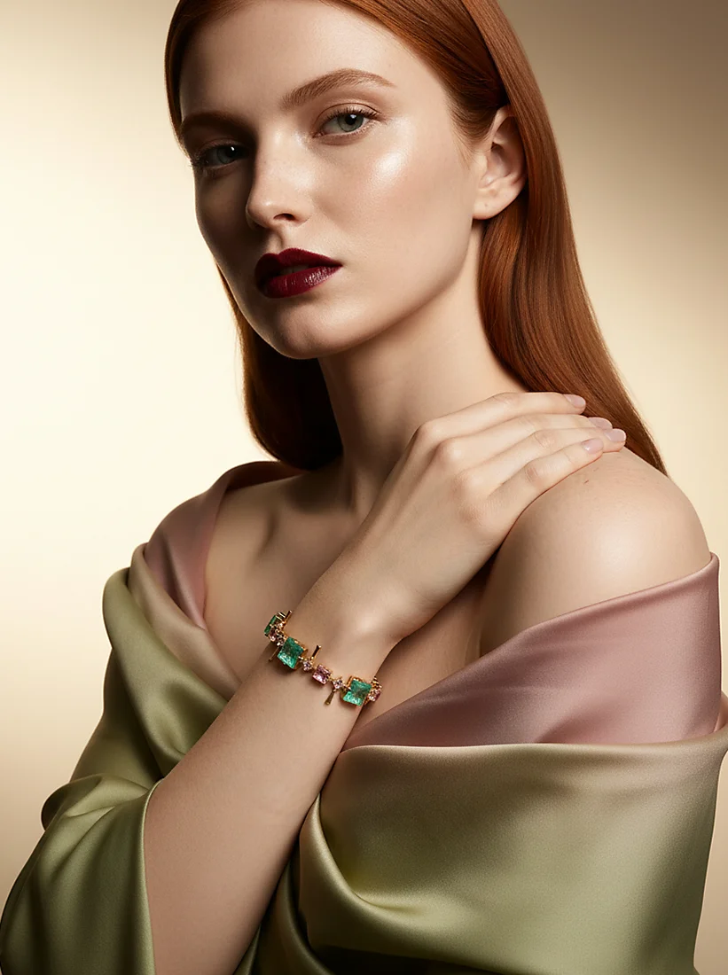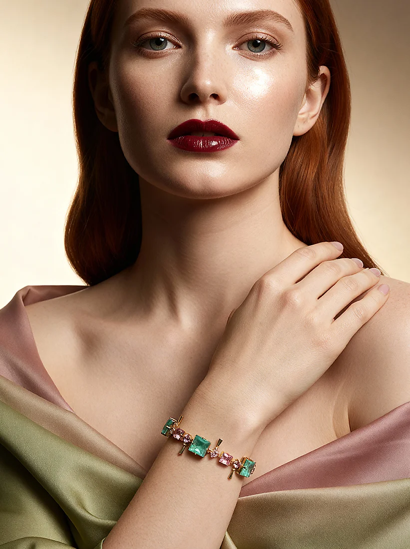 Uma composição luminosa que une tons de verde e rosa em pura harmonia, envolvendo o pulso com elegância radiante. As gemas cintilantes criam um jogo de cores encantador, revelando delicadeza sem perder a força do design. É uma peça que ilumina cada gesto, trazendo sofisticação poética e um charme irresistível.