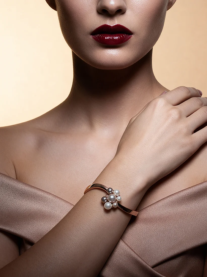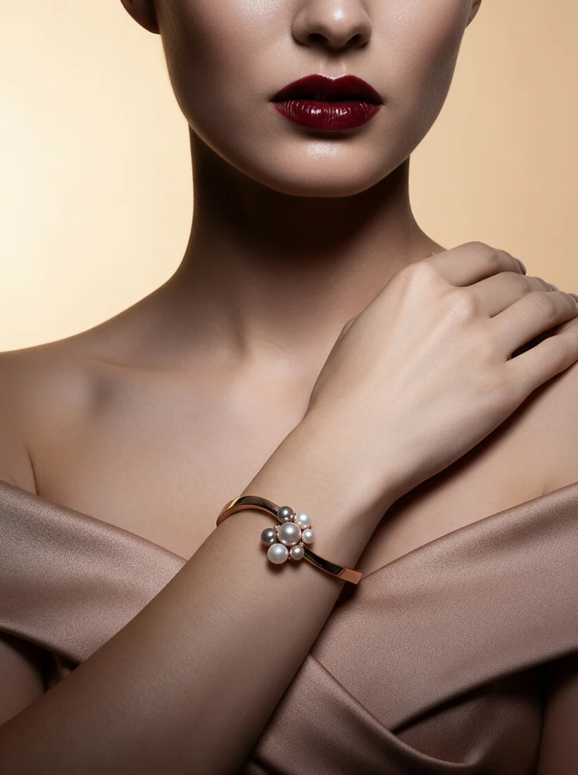 Um buquê perolado floresce sobre o pulso, envolvendo-o com brilho suave e feminilidade serena. Suas nuances elegantes criam um efeito encantador, elevando cada gesto com graça atemporal.