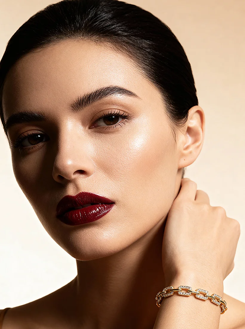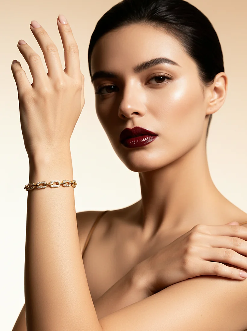 Uma pulseira de elos dourados cravejados que transmite brilho sofisticado e elegância contemporânea.