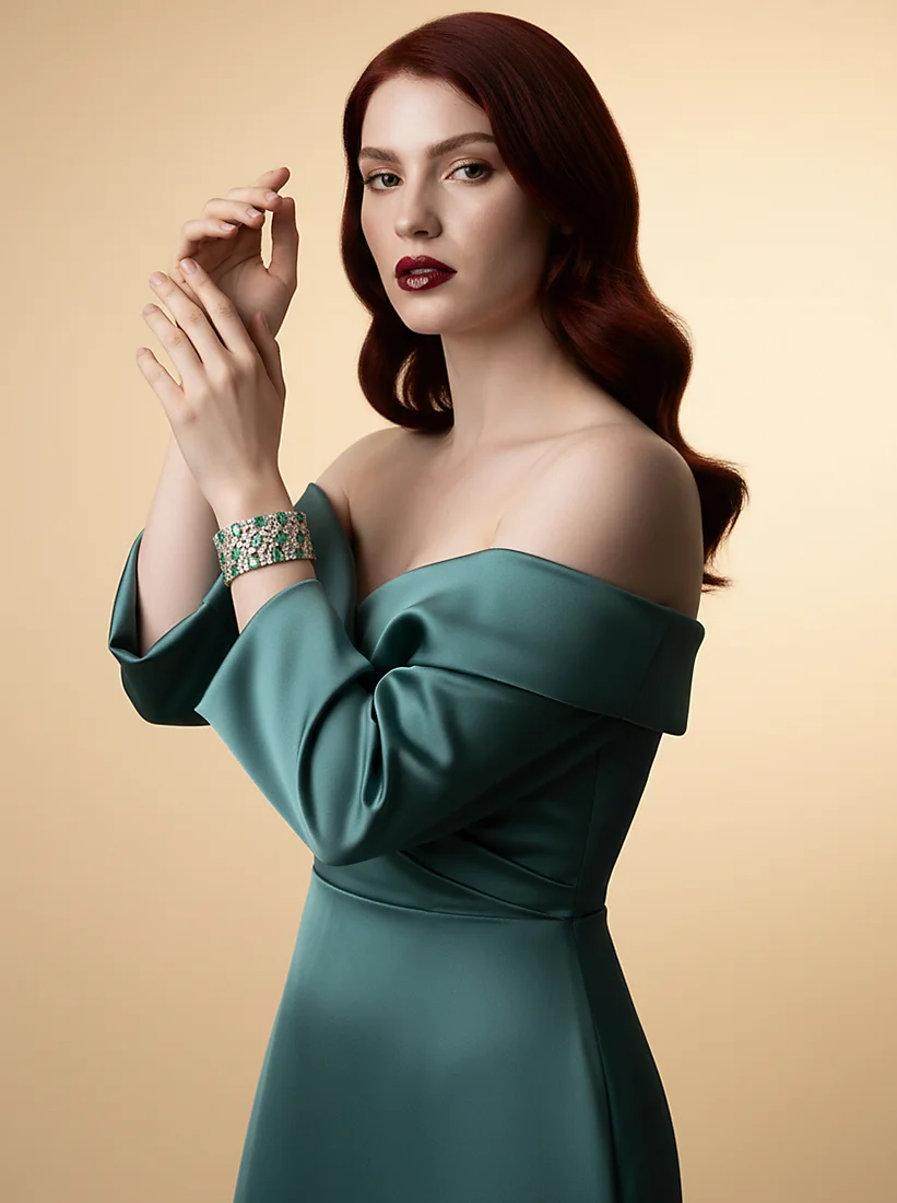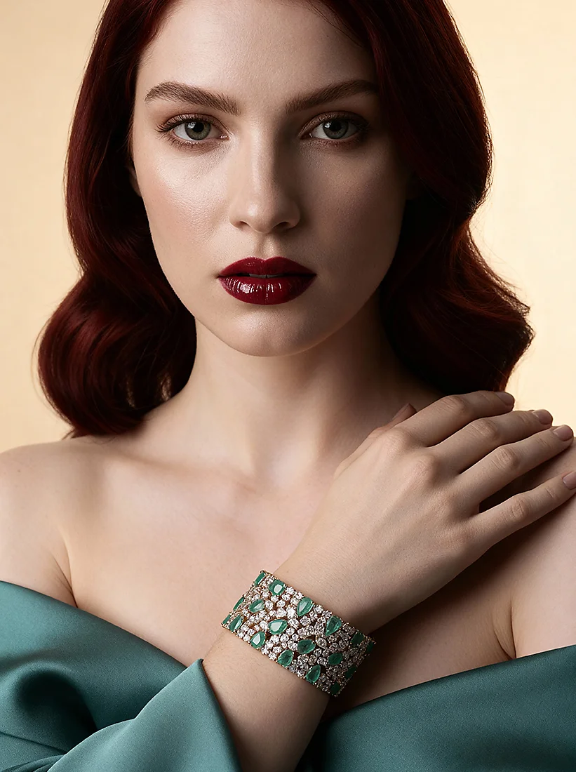 Esmeraldas exuberantes brilham como joias reais em cada movimento, envolvendo o pulso com luxo marcante e beleza inesquecível. Uma peça poderosa para quem deseja brilhar com elegância absoluta.