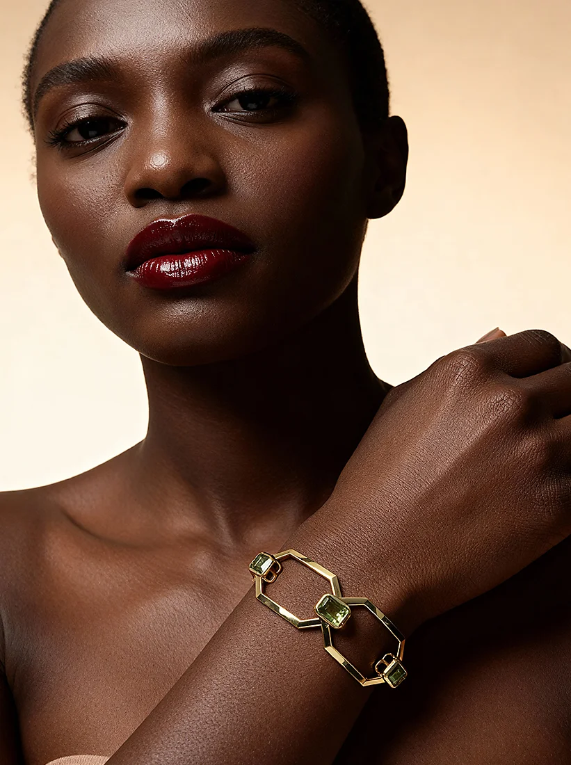 Linhas geométricas abraçam o pulso com elegância minimalista, enquanto o brilho verde adiciona um toque de frescor luxuoso. Uma joia que exala força estética e charme contemporâneo em cada detalhe.