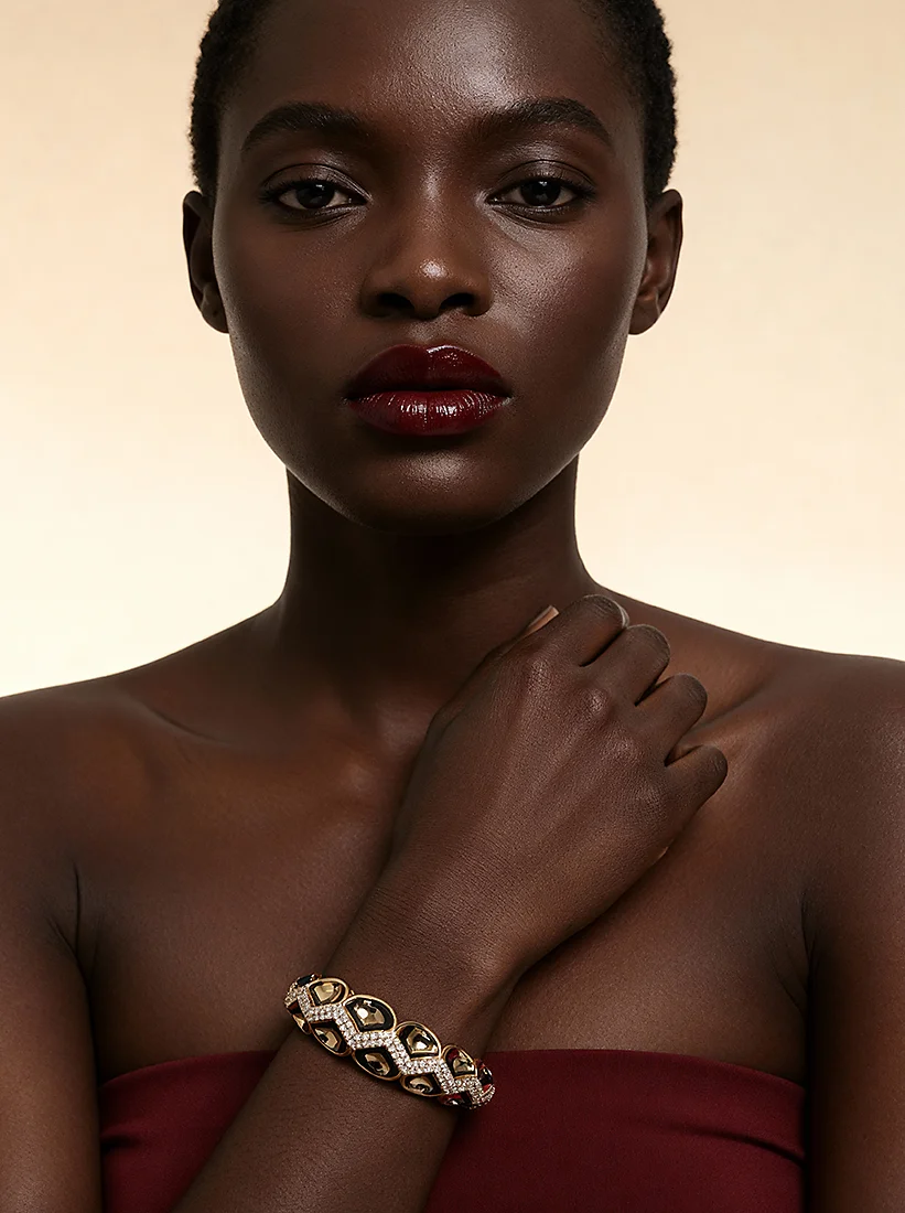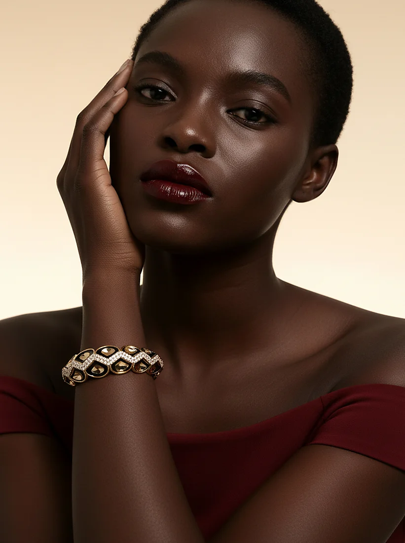 Um contraste elegante envolve o pulso com força luminosa, unindo profundidade e brilho em perfeita harmonia. O jogo entre o dourado e o tom escuro cria uma presença marcante, revelando sofisticação e charme atemporal em cada movimento.