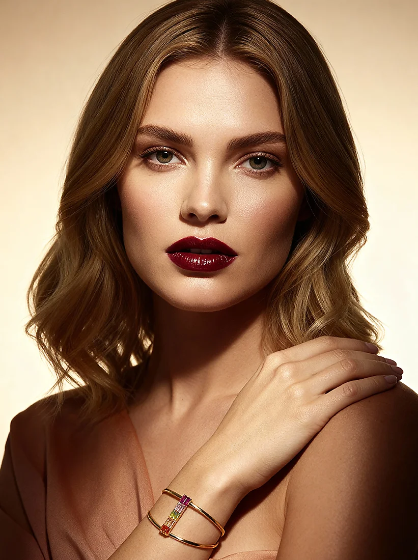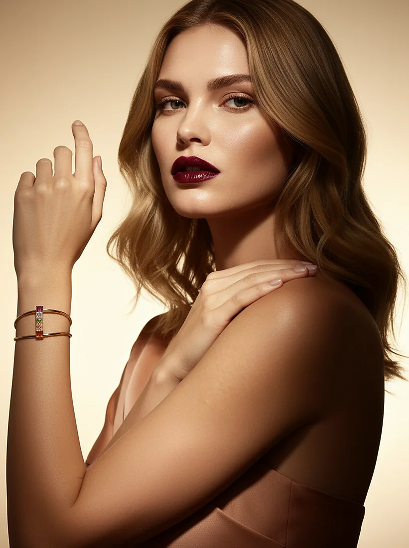Um prisma de cores vibrantes conecta dois aros dourados, criando um brilho contemporâneo que transforma cada gesto em pura elegância.