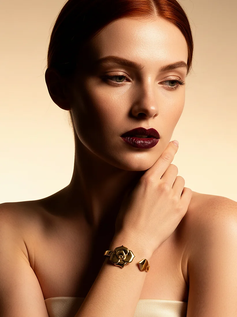 Uma rosa dourada repousa delicadamente sobre o pulso, trazendo charme natural e brilho poético a cada gesto.