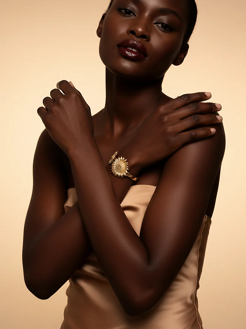 Um dourado radiante abraça o pulso com charme solar, revelando feminilidade e presença luminosa. Suas formas florais criam um brilho suave e elegante, destacando o gesto com beleza atemporal.